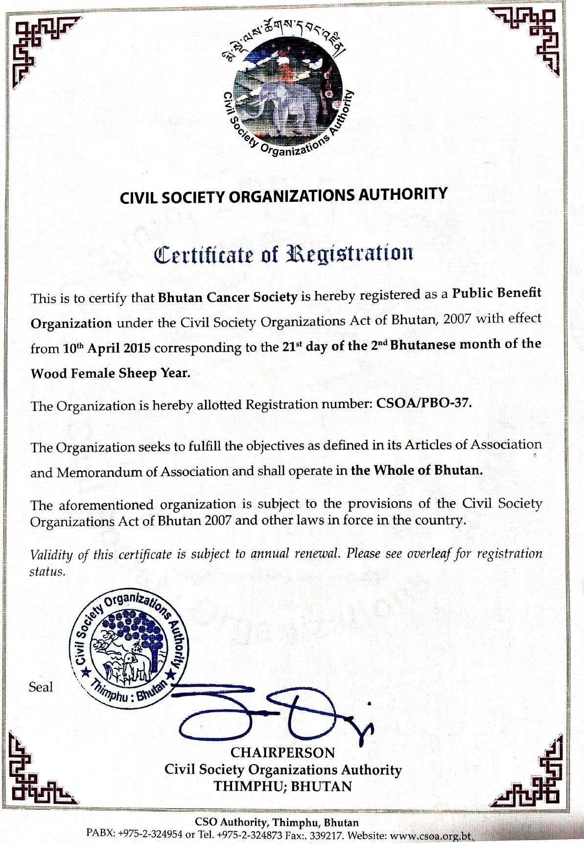 Bhutan Cancer Society (BCS) is a Public Benefit Organization registered under the Civil Society Organizations Authority of Bhutan.